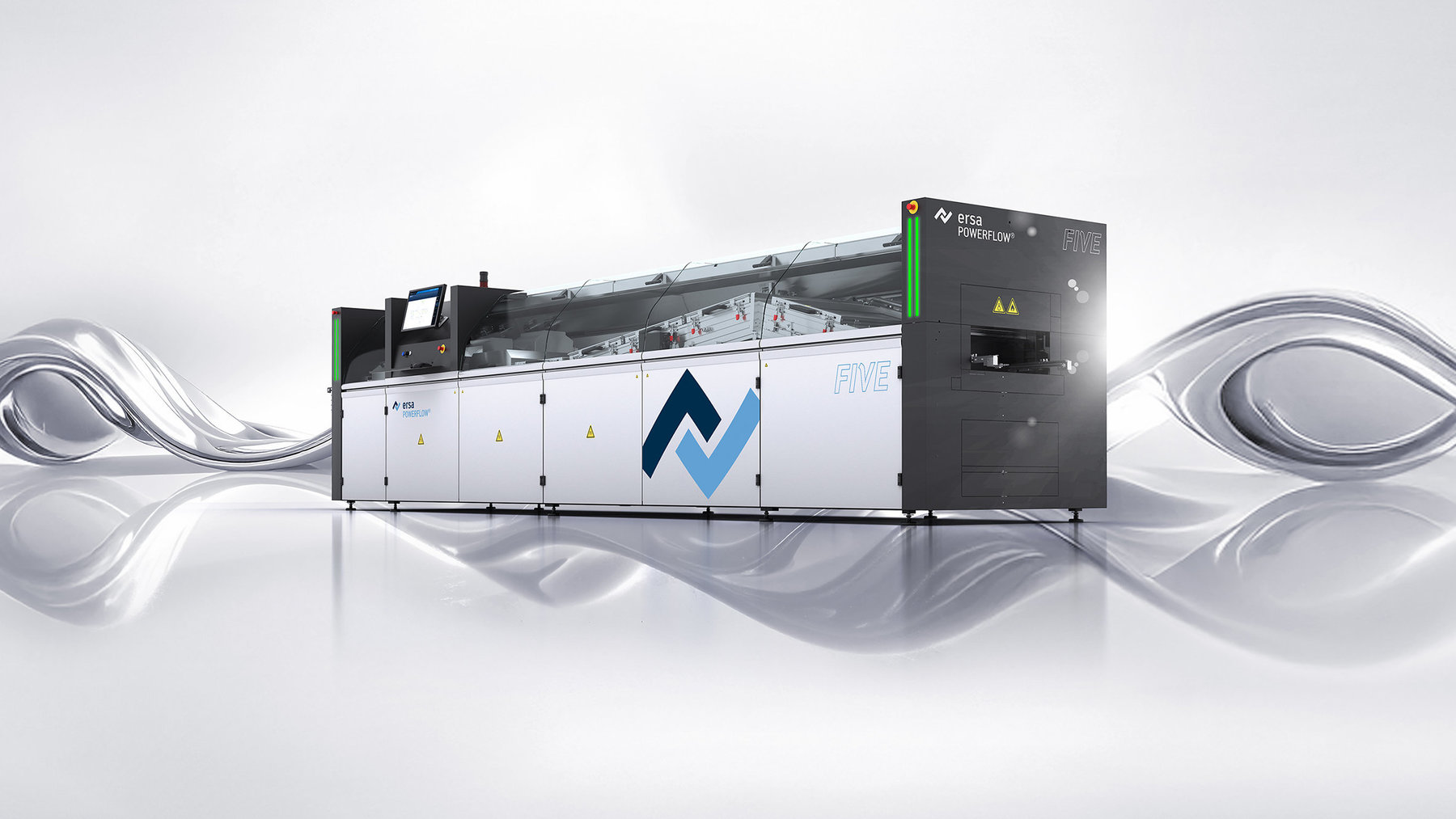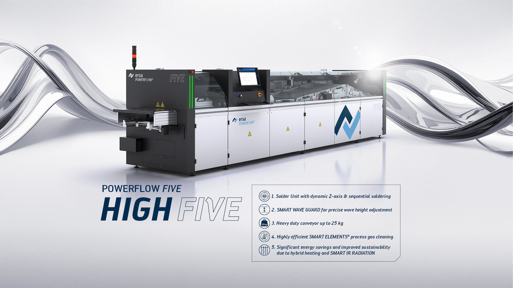 With the new POWERFLOW FIVE, Ersa is presenting an innovative wave soldering system at Productronica 2025 which sets new standards in terms of performance, flexibility, energy efficiency, and total cost of ownership (TCO) due to advanced technologies. This system is targeted at electronics manufacturers with high production volumes and demanding applications, as in power electronics, for example. The design of Ersa´s new flagship is focused on adaptive production processes. POWERFLOW FIVE adjusts flexibly to different requirements while ensuring maximum efficiency and economic viability.