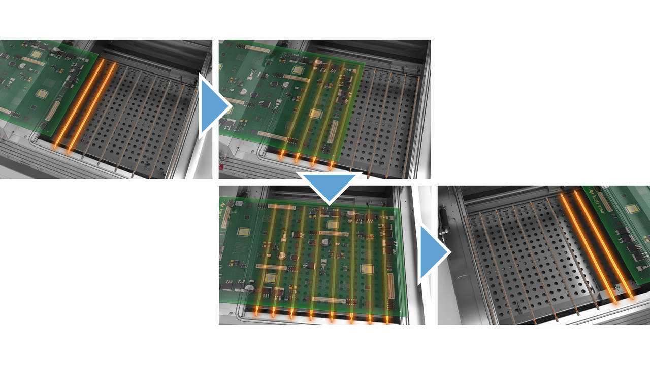 To guarantee consistent, reproducible soldering results, the POWERFLOW FIVE is equipped with integrated measuring technology that regularly monitors the solder wave height and automatically adjusts the solder overflow as needed. This always maintains consistent wetting and stable pressure at the nozzle outlet. Productivity is enhanced by smart, maintenance-friendly features such as SMART ELEMENTS® for process gas cleaning. The hybrid heating system combines medium-wave infrared emitters and convection heating to achieve up to 50% more efficient heat transfer with the same energy consumption. Additionally, the modules can be easily removed for maintenance in just 15 minutes.