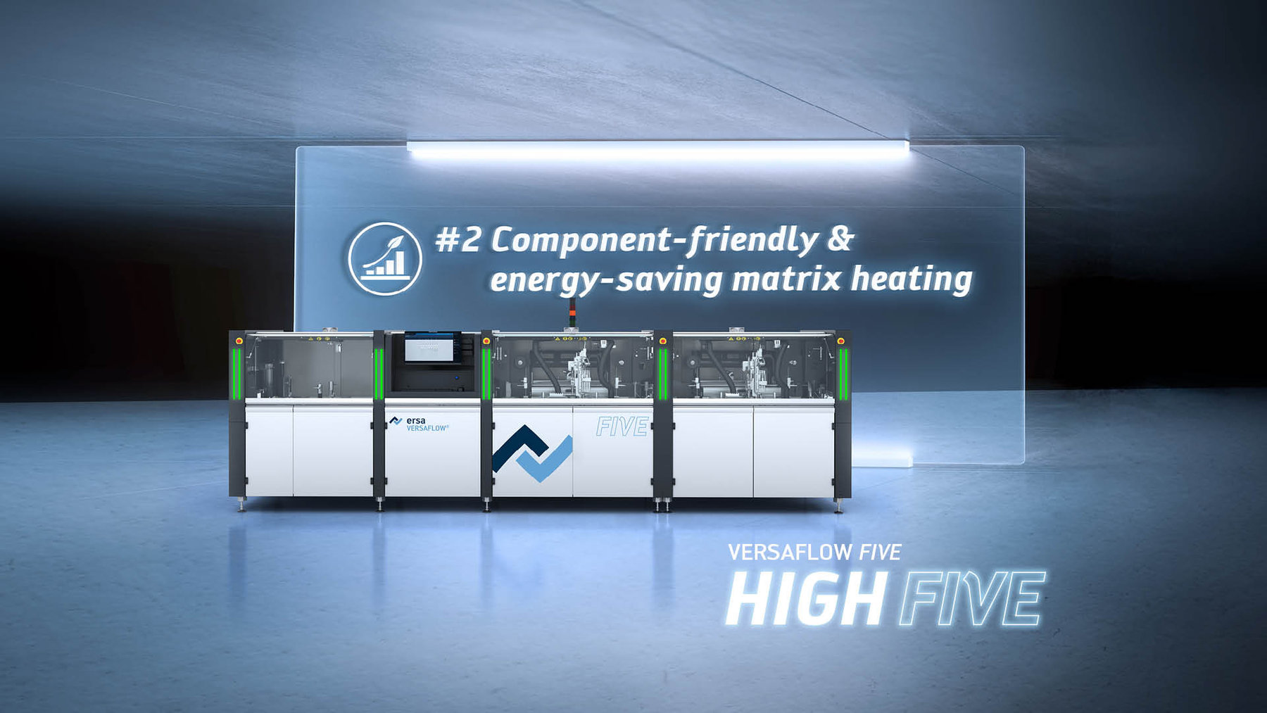 With the new VERSAFLOW FIVE, Ersa is presenting the new benchmark in high-end selective soldering at Productronica 2025. Having been developed for the most demanding industries - from automotive and aerospace to industrial electronics - it offers an unprecedented combination of throughput, process reliability, ease of use, and energy efficiency. Optimized for a wide range of different PCB formats (up to 685 mm in length), the machine also features a new, modern design.