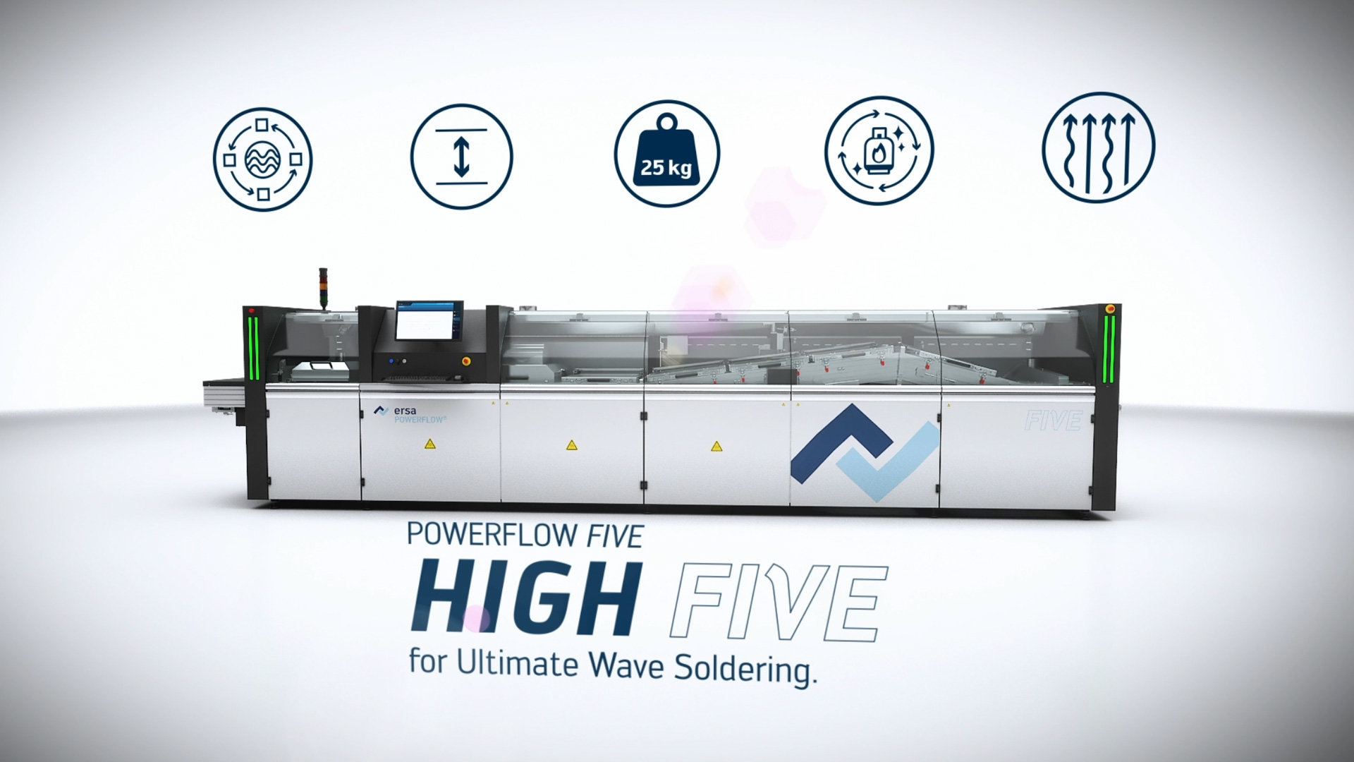 The Ersa POWERFLOW FIVE is the latest generation of Ersa wave soldering systems and sets the benchmark in the ultra-high segment. It is specifically designed to meet the dynamic requirements of today´s and tomorrow´s markets - for example, in the areas of e-mobility, 5G, and smart grids. The POWERFLOW FIVE is aimed at electronics manufacturers with a particular focus on demanding applications in power electronics.