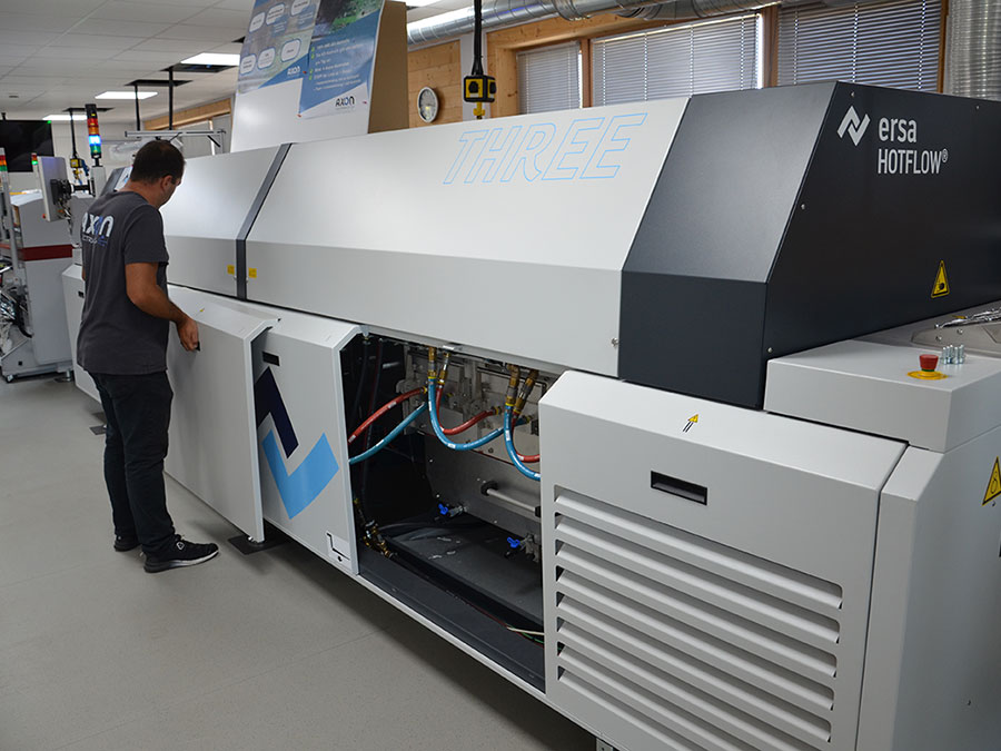 One of the main criteria for the purchase of the new reflow oven was very pragmatic: due to the local conditions, the SMD line could not be longer than 17 meters. As a result, the company was looking for a compact reflow system with the highest possible throughput and output. The technical challenge was the assembly to be soldered and the speed of the pick-and-place machine. The top side of the board is densely populated with many different components; the bottom side has only a few components. Every 14 seconds, a board leaves the pick-and-place machine. Is the time the board spends in a short reflow oven sufficient to reliably create all the solder joints? It was a logical step for AXON to contact Ersa. With the HOTFLOW THREE 16, Ersa has a compact and powerful 8-zone, 5.60m-long reflow system in its portfolio that met the requirements.