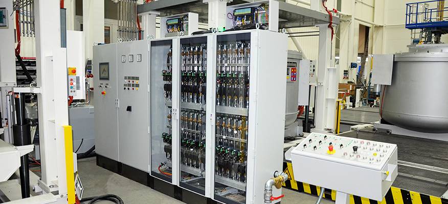 For this reason, the decision was made in favor of the new size 22-17 with a larger clamping surface for large moulds. In addition to the large clamping unit of the casting machine with a large clamping surface, the large low-pressure furnace with occupancy and use of multiple riser tubes was also a key to success. A 2,800 kg furnace is used as standard, currently with up to ten riser pipes. Furnaces are changed with the tried-and-tested furnace shuttle almost during the idle time of the casting machine in order to design the entire line effectively and keep the production factor high. Cooling also plays a decisive role in meeting the high quality requirements - the system has 64 mixed cooling circuits for this purpose.
