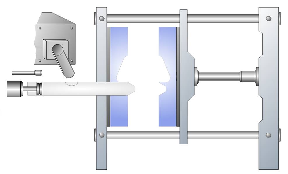 The halves of the die-casting mold are each mounted on a fixed and a movable machine plate of the horizontally aligned die-casting machine. Due to the high pressure of up to 1,200 bar during casting, locking devices with high locking forces are required to hold the die casting mold together. As these have a relatively high melting point, cold chamber die casting machines are mainly used for aluminum alloys. Here, the casting set is located outside the molten metal. The liquid metal is dosed into the filling chamber and the piston shoots the metal into the mold. When the metal has solidified, the two halves of the mold open and the casting is automatically pushed out of the mold with the help of ejector pins.