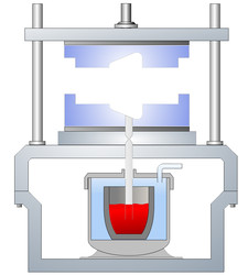 As with die casting, the halves of the mold (die) are mounted on a fixed and a movable machine plate, but the machine is arranged vertically. The holding furnace for the molten metal is located under the fixed clamping plate - by applying a pressure of up to max. 1 bar to the furnace, the molten metal (primarily aluminum, but also magnesium) rises from below into the mold cavity, usually a permanent mold, by means of riser(s). However, sand molds are also possible. This causes the liquid metal to move upwards against the force of gravity. After the mold has been filled, the pressure is maintained during solidification in order to enable replenishment to compensate for the volume deficit (shrinkage cavity) during the transition from the liquid to the solid state. This naturally requires solidification from top to bottom in the most directional way possible.