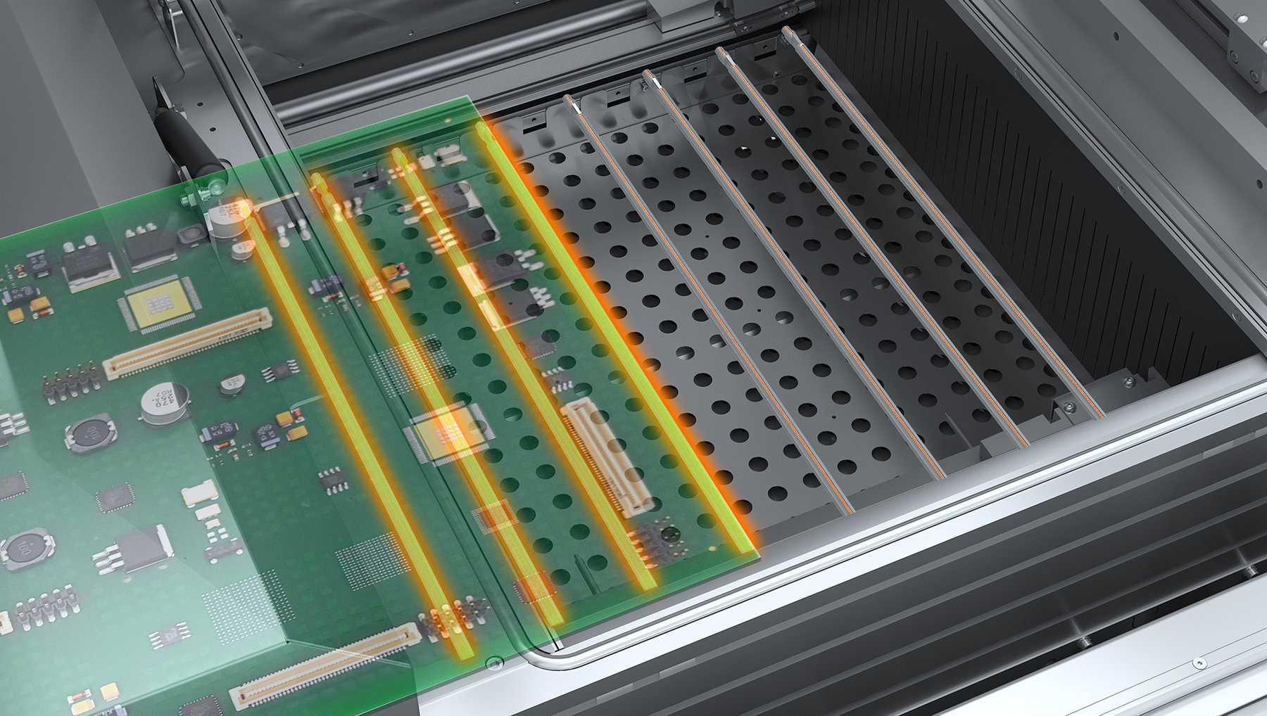 The new matrix heating system of the VERSAFLOW FIVE enables adaptive heat input during preheating. Only the heating zones that are actually needed are activated, which reduces energy consumption in proportion to the heated area. The savings therefore depend on the product, but in an average production mix, an average of 20% energy savings are possible with infrared heaters. Since infrared heaters are usually the largest energy consumers in a selective soldering system, the savings potential is considerable.