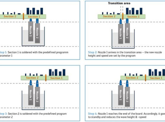 For this purpose, the PCB is divided into sectors under program control, which are stored with parameters. This means that each sector can be soldered with individual configurations, ensuring highly flexible processes. In addition, the contact time of the solder wave with the assembly can be stored in the soldering program. This offers maximum process control when moving the assembly into and out of the solder wave. In combination with the nozzle spacing, an optimum solder flow is achieved, resulting in perfect solder joints - especially for assemblies that are equipped with a high proportion of digital components in addition to power electronics.